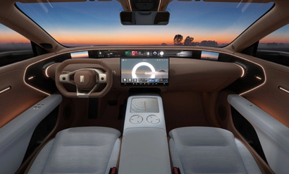 The dashboard of the 07 features an array of two or four displays in a two-tier arrangement. A wide aspect ratio 35.4-inch 4K upper display acts as the gauge cluster and information display, and is placed atop a shelf near the base of the windshield. If equipped with digital side mirrors, the upper display is flanked by dual 6.7-inch screens displaying the side mirror camera feeds. A 15.6-inch touchscreen mounted lower on the dash is used to operate the infotainment system and to configure the upper display, and uses the HarmonyOS 4.0 operating system supplied by Huawei.