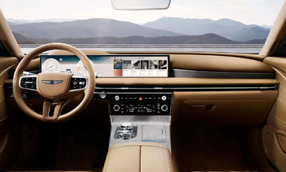 The interior contains recycled materials, including leather made with natural dye (seats, console and rear seat armrests), scrap wood produced after making furniture ("forged wood" garnish) and thread spun from plastic bottles. The Electrified G80 offers a Disconnector Actuator System (DAS), an Active Noise Control-Road (ANC-R) system, a Preview Electronic Control Suspension (Pre-view ECS), a solar charging roof, a Vehicle to Load (V2L) system and a 400/800V multi rapid charging system.