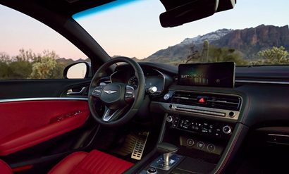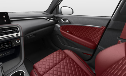 The interior's center console is constructed out of soft-touch plastics, leather and metal accents that are slightly angled toward the driver. The layout has three large knobs for the climate controls, an eight-inch touch screen, and a small electronic shifter. The interior appointments on the G70 include quilted leather seating surfaces, along with brushed aluminum and stainless steel trim.