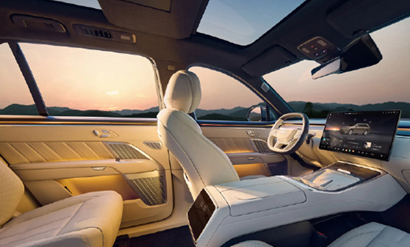 The L90 is available in 6- or 7-seater 3-row variants. The dashboard features a 17.2-inch 3K central infotainment display, and features a 35-inch AR-HUD instead of an instrument cluster. It has 3-zone climate control and the rear passengers have access to an 8-inch control screen, a 17.3-inch 3K ceiling-mounted entertainment display and a 8.86-litre (0.313 cu ft) 0–50 °C (32–122 °F) temperature controlled compartment. In the 6-seat configuration, every seat has heating, ventilation, and massaging functions. It is available with a 2048-watt 23-speaker 7.1.4 surround sound system and a 1.1 m2 (12 sq ft) sunroof. The ceiling and pillars are upholstered in microfiber, and it has two wood accent options.[4][8] Other features present include a gear shifter behind the steering wheel, two wireless charging pads, and dual cup holders.[9] It has a 430-litre (15.2 cu ft) trunk with a 106-litre (3.7 cu ft) underfloor storage area in addition to a 240-litre (8.5 cu ft) frunk.