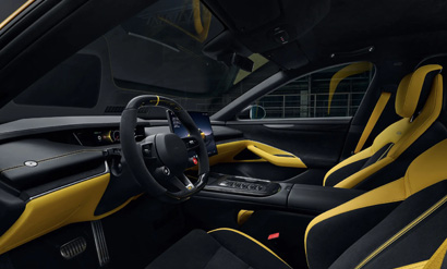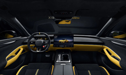The interior receives a modified design and comes in three color options, with Alcantara and carbon fibre surfaces, a square-shaped sports steering wheel, and racing-style seats with additional bolstering. Carbon fibre surfaces are used on the front seatbacks, steering wheel, and doorsills, totaling 3.74 m2 (40.3 sq ft), which Xiaomi says saves 12 kilograms (26 lb) of weight.[37] The SU7 Ultra has 5 m2 (54 sq ft) of Alcantara throughout its interior, including on the steering wheel, seats, doors, and dashboard. Xiaomi says that Alcantara was chosen to reduce light reflections and save up to 50% weight compared to conventional leather. The front seats have a 10-point massaging function, all the side windows are double-glazed, and it is equipped with a 25-speaker audio system including speakers placed inside the driver's seat headrest.[36] The infotainment system's software has a unique skin, and there are three artificial vehicle sound options.