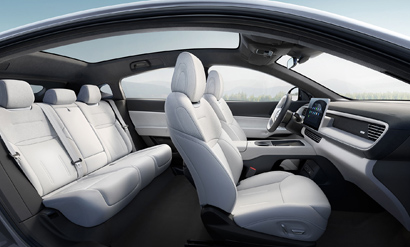 The interior features a 10.2-inch digital instrument cluster integrated into the dashboard and a 14.96-inch standing infotainment touchscreen both powered by a Qualcomm Snapdragon 8155P and has integrated HVAC controls, allowing for a nearly buttonless dashboard. The centre console features dual 50-watt cooled wireless charging pads and two circular cupholders ahead of an armrest. The trunk has a capacity of 571 litres (20.2 cu ft), expanding to 1,374 litres (48.5 cu ft) with the rear seats folded down.