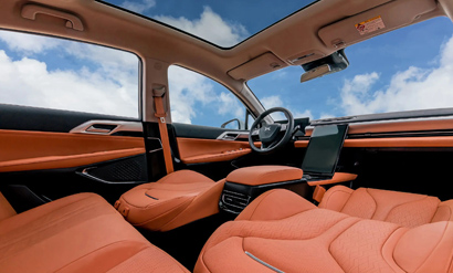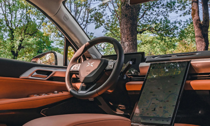 The passenger compartment is kept in a minimalist design, dominated by a vast vertical multimedia system touch screen located at an angle between the edge of the dashboard and the central tunnel, characterised by a 15.6-inch diagonal. The vehicle is equipped with a third-generation Xmart OS 3.0 multimedia system with a voice control function. The P5 is known for its sleeping/cinema mode, front seats can lie flat to support an air bed along with the rear seat bottom cushions. Optional full-width projection screen, rear centre console mini-fridge, 220 V third party appliances.